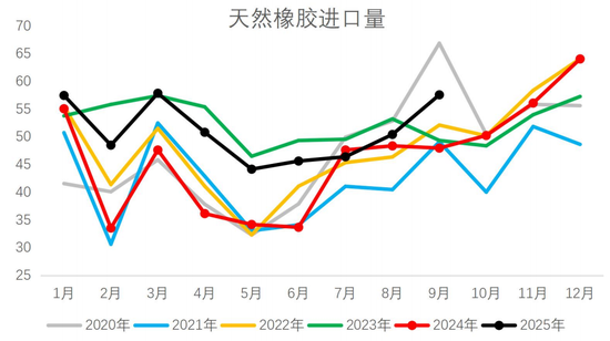 据海关数据统计,2025年9月中国天然橡胶(含技术分类、胶乳、烟胶片、初级形状、混合胶、复合胶)进口量59.59万吨,环比增加14.41%,同比增加20.92%,2025年1-9月累计进口数量471.72万吨,累计同比增加19.65%。
