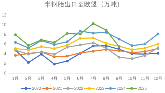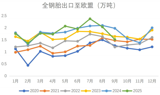 但外需方面,据海关数据统计,2025年9月,中国卡客车轮胎出口至欧盟1.52万吨,环比-25.55%,同比-23.38%,累计同比-0.52%,涨幅缩减3.08个百分点。中国小客车轮胎出口至欧盟5.44万吨,环比-38.92%,同比-22.75%,累计同比+7.27%,涨幅缩减3.77个百分点。由数据可以看出,9月前确实存在因欧盟反倾销调查而起的一波抢出口,预计四季度外需方面将有减量。因此胶价上方压力仍存,需要关注国内相关政策对内需的提振。