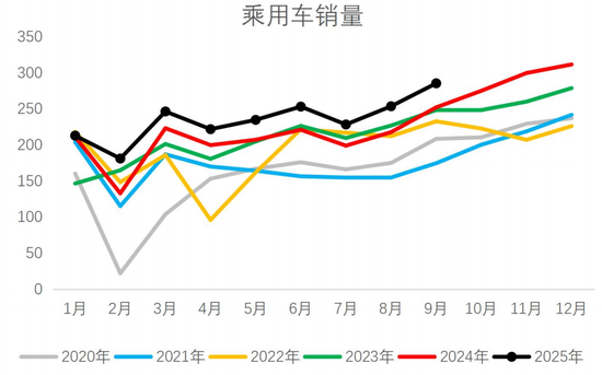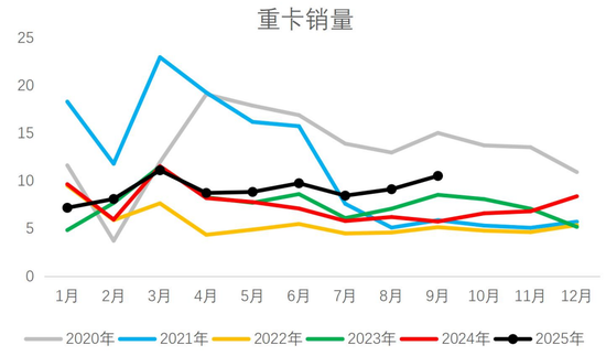 2025年9月,我国重卡销量10.56万辆,环比+15.24%,同比+82.95%,累计同比+20.32%;我国乘用车销量285.85万辆,环比+12.53%,同比+13.20%,累计同比+13.58%。